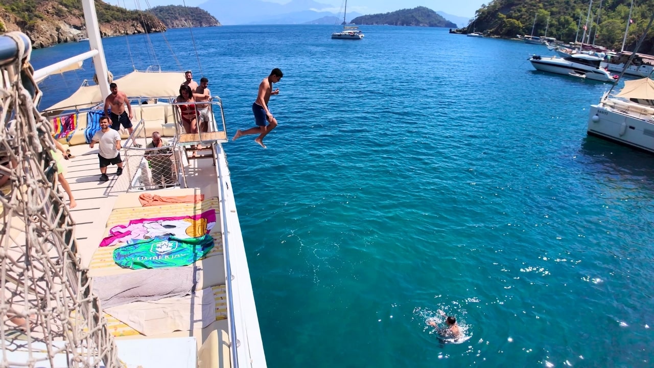 Fethiye’nin eşsiz 12 Ada rotasında turkuaz sularda unutulmaz bir gün sizi bekliyor. Kızılada, Yassıca Adası, Akvaryum Koyu ve daha birçok cennet koyda yüzme keyfi, lezzetli öğle yemeği ve profesyonel rehber eşliğinde gün boyu süren harika bir tekne turu deneyimi.